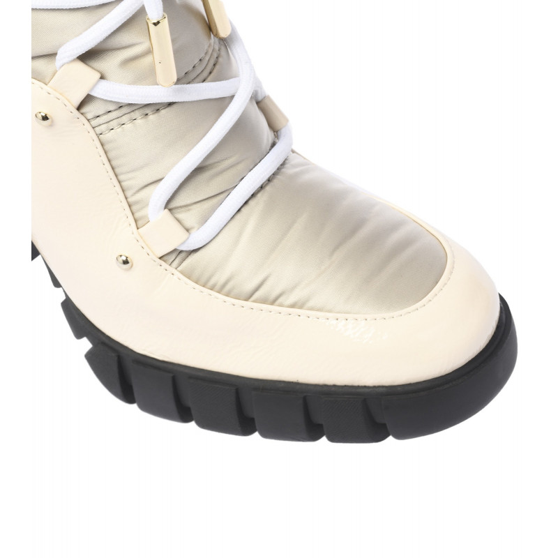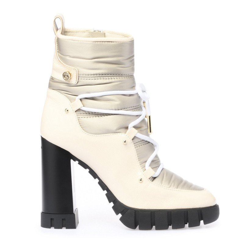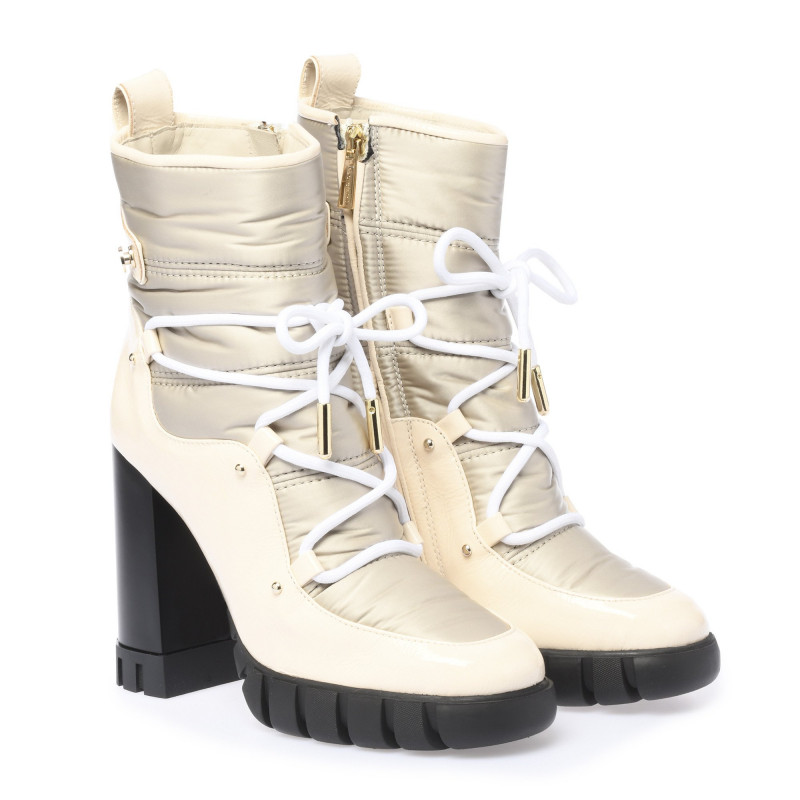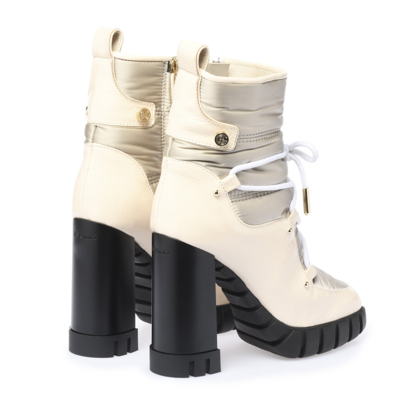 Kotníkové boty v kombinaci lesklé kůže v béžové barvě a nylonu v šedé barvě. Boční zapínáni na zip a šněrování vpředu. Podpatek 11cm, platforma 2,5cm. Gumová podrážka.Baldinini, vyrobeno v Itálii