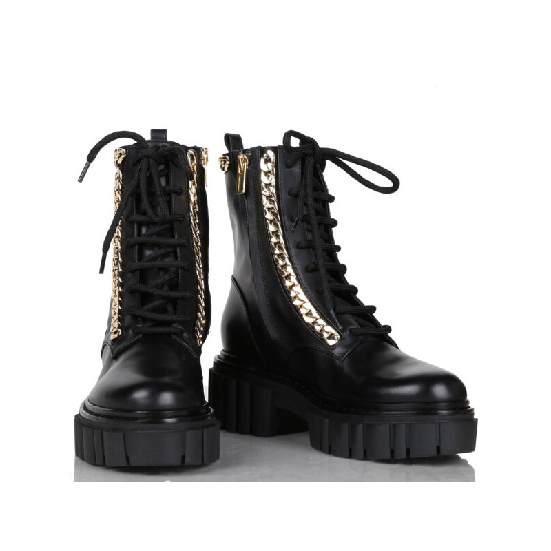 Dámské kožené kotníkové boty na zavazování a zip. Barva - černá. Kovová ozdoba ve zlaté barvě. Gumová podrážka. Výška podpatku: 5cm.