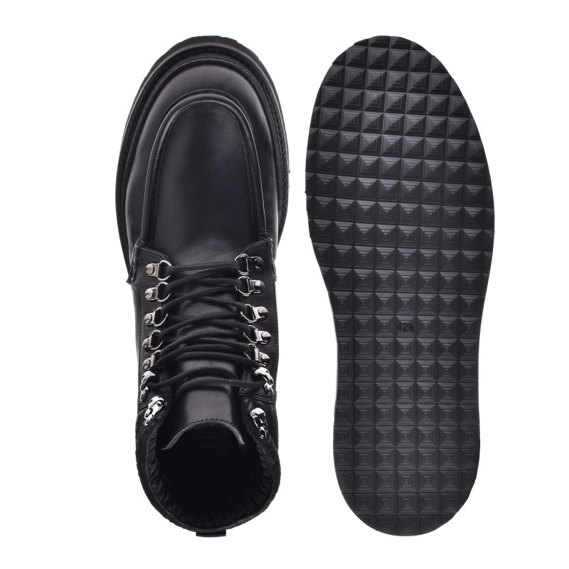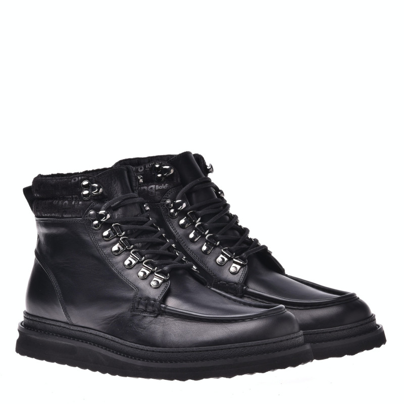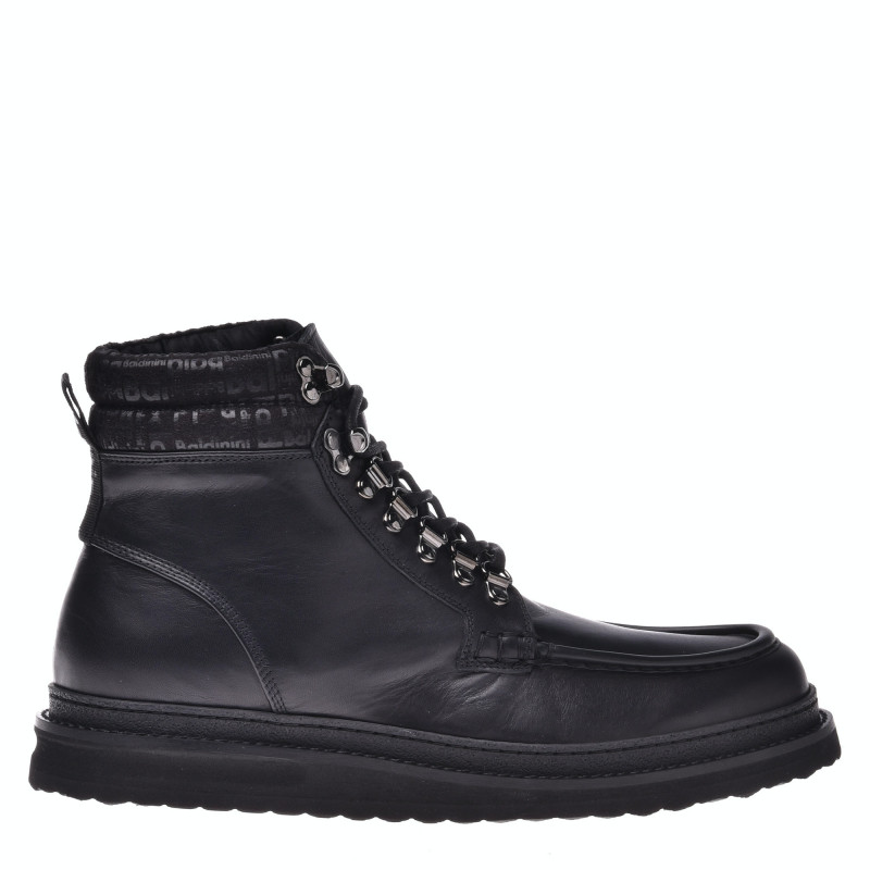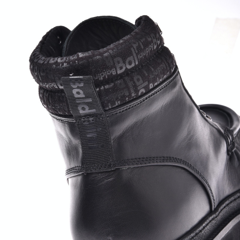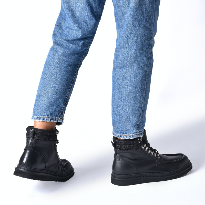 Pánské kožené, kotníkové boty v černé barvě. Zapínání na šňůrky. Kožená podšívka, kožená stélka uvnitř. Gumová podrážka. Baldinini, vyrobeno v Itálii