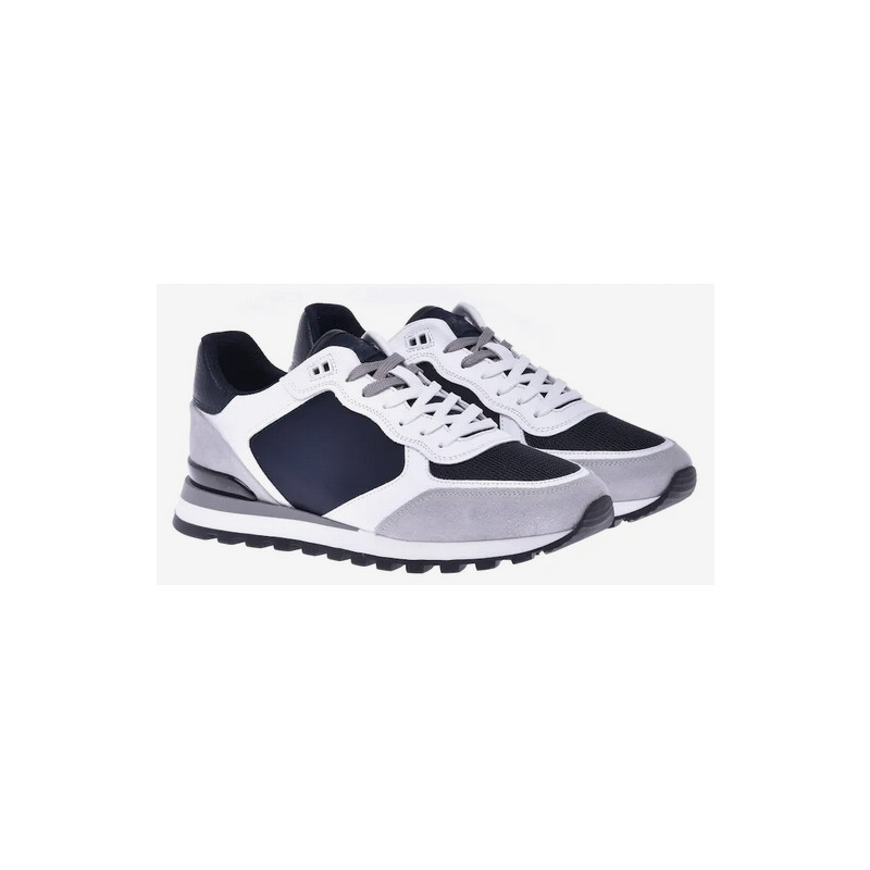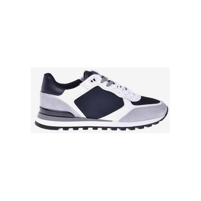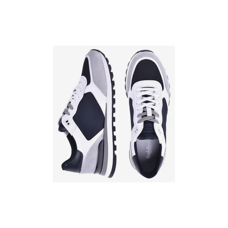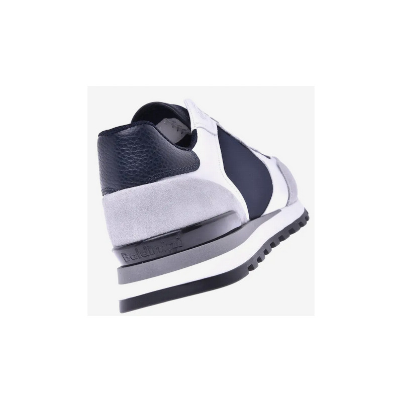 Pánské kožené tenisky v kombinací s bílou, modrou a šedou barvou. Materiál: kůže, technická látka a neopren. Dvojité dvoubarevné šněrování. Pružná gumová podrážka.Baldinini, vyrobeno v Itálii
