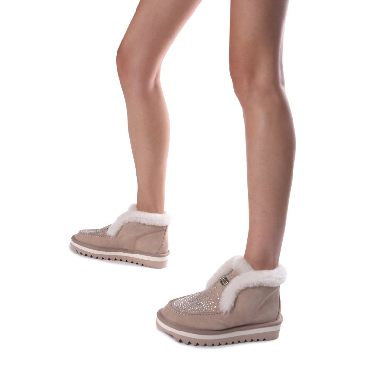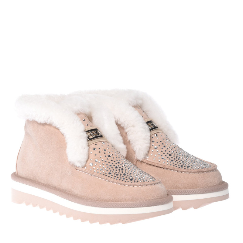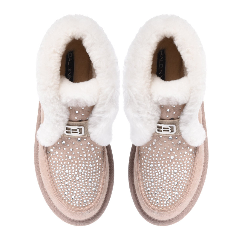 Svršek: Semišová kůže/kamínkyVnitřek: KožíšekPodrážka: GumaBarva: Růžovo-béžováZapínání: Natahovací Tloušťka podrážky: 2/3cmBaldinini, vyrobeno v Itálii.