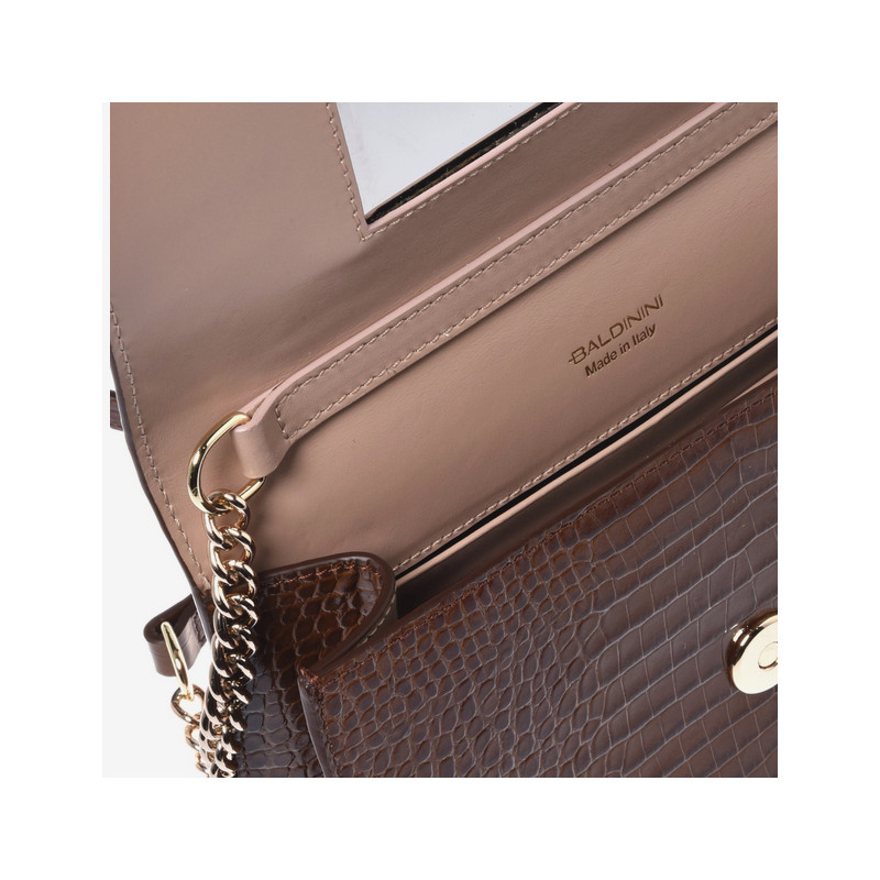 Provedení: Přírodní kůže s krokodýlím vzoremOzdoby: Zlatý kovBarva: HnědáUvnitř: Přihrádky na kartyRozměry: 20 x 13 x 6.5 cmJiné: Odnímatelný kovový popruhBaldinini, vyrobeno v Itálii.